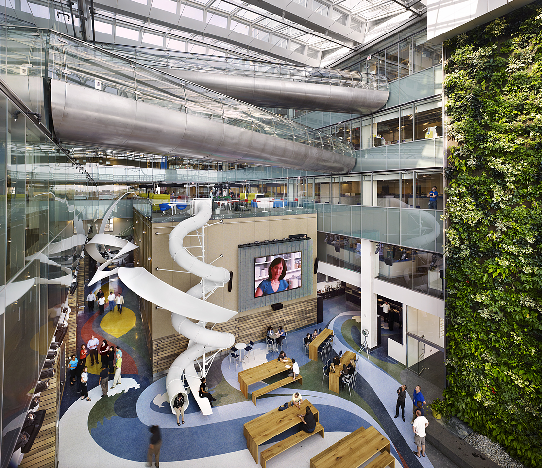 Examples? There we go! Meetings in the room which looks like a small jungle with over a hundred large plants, slides and sliding poles linking the floors, or ever-full fridges, up to 100 metres away from work stations. In a nap room full of aquariums, employees can take a nap in the bathtub filled with sponges. Employees have at their disposal free cafes and massages, a gaming room, concert and cinema halls as well as a private gym.