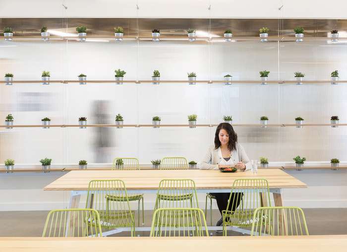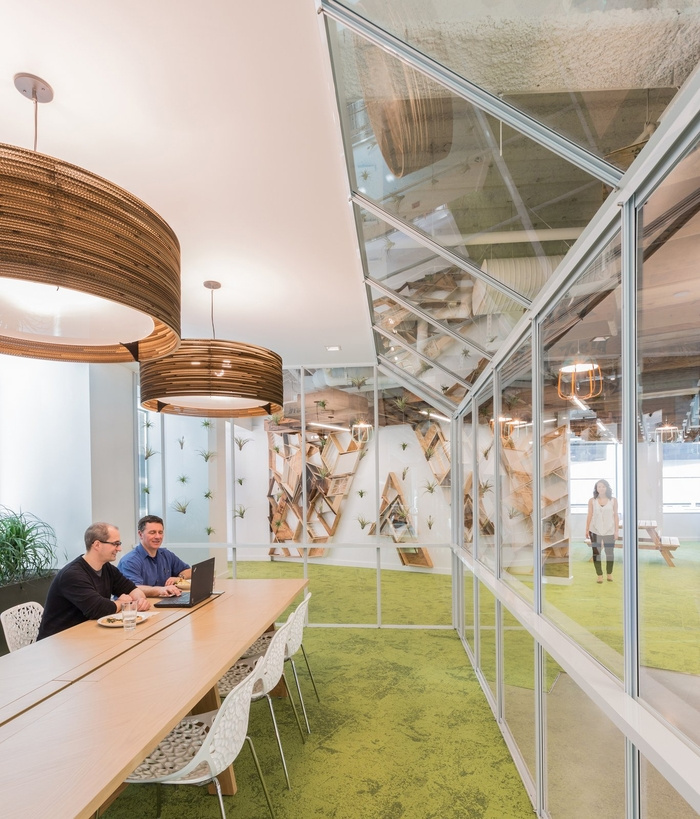 Eco-friendly solutions in the spirit of biophilia are a huge advantage of the Canadian office. In addition to the reduced consumption of energy and water as well as the use of local recycled materials, it is also worth emphasising the presence of a huge green wall of live plants that stretches in the open space on all five floors of the building and tirelessly filters air in the office.
