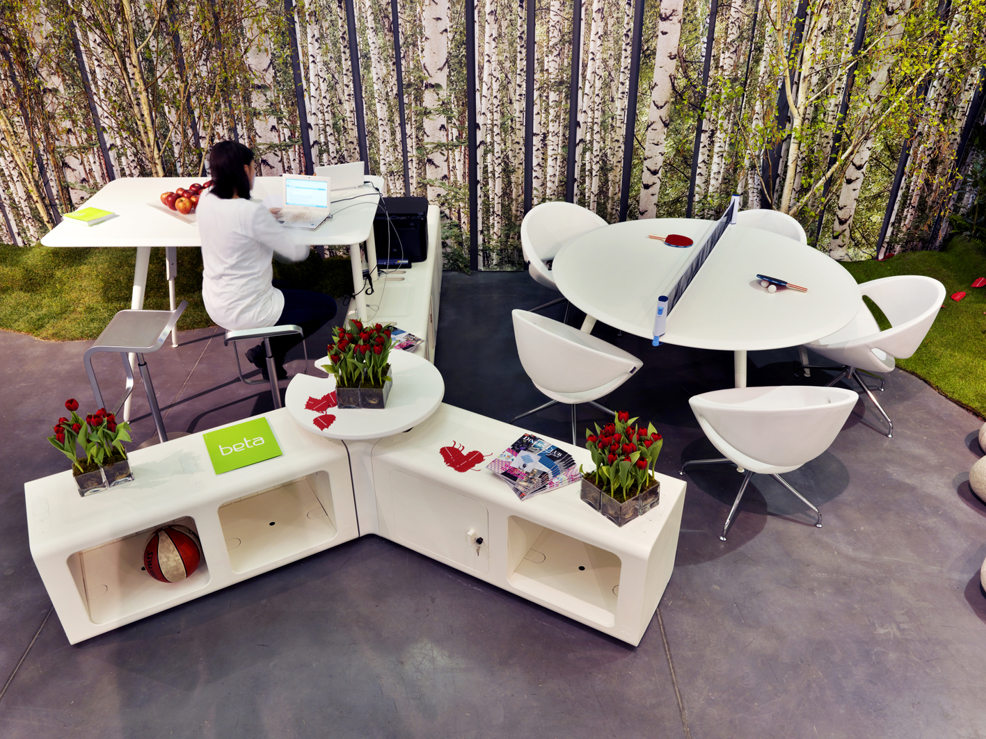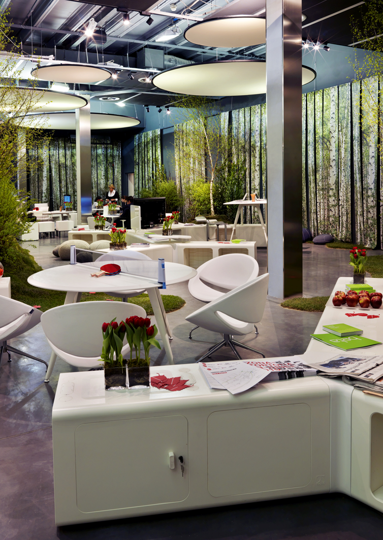 The application of live plants and moss, grass rugs, picnic tables, as well as wooden boxes mounted on the walls and ceilings makes employees feel the contact with natural landscape. This effect is additionally enhanced by large nature photo wallpapers. Geometric shapes, professional woodwork or a smart logotype game (just look at the composition built around the letter A in the photos) are also a great strength of this unusual arrangement.