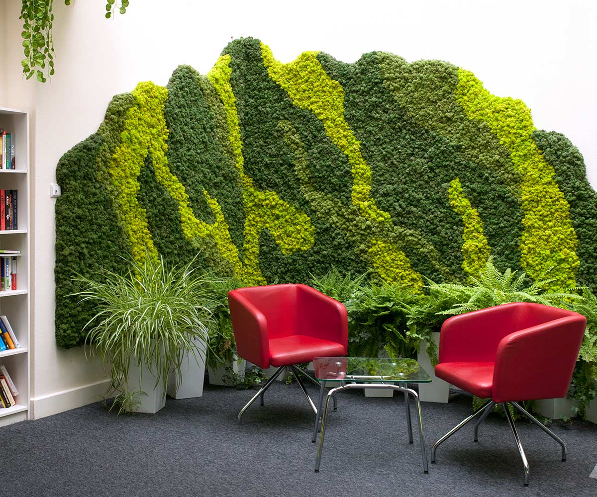 We have designed a moss wall made in an organic shape, using a few shades of green. We have arranged them in irregular waves to stimulate curiosity and obtain the effect of depth. Just a few minutes in its surroundings is enough to feel the inner peace and calm the senses. We have also applied natural greenery, loosely falling from a ceiling beam and lush potted flowers.