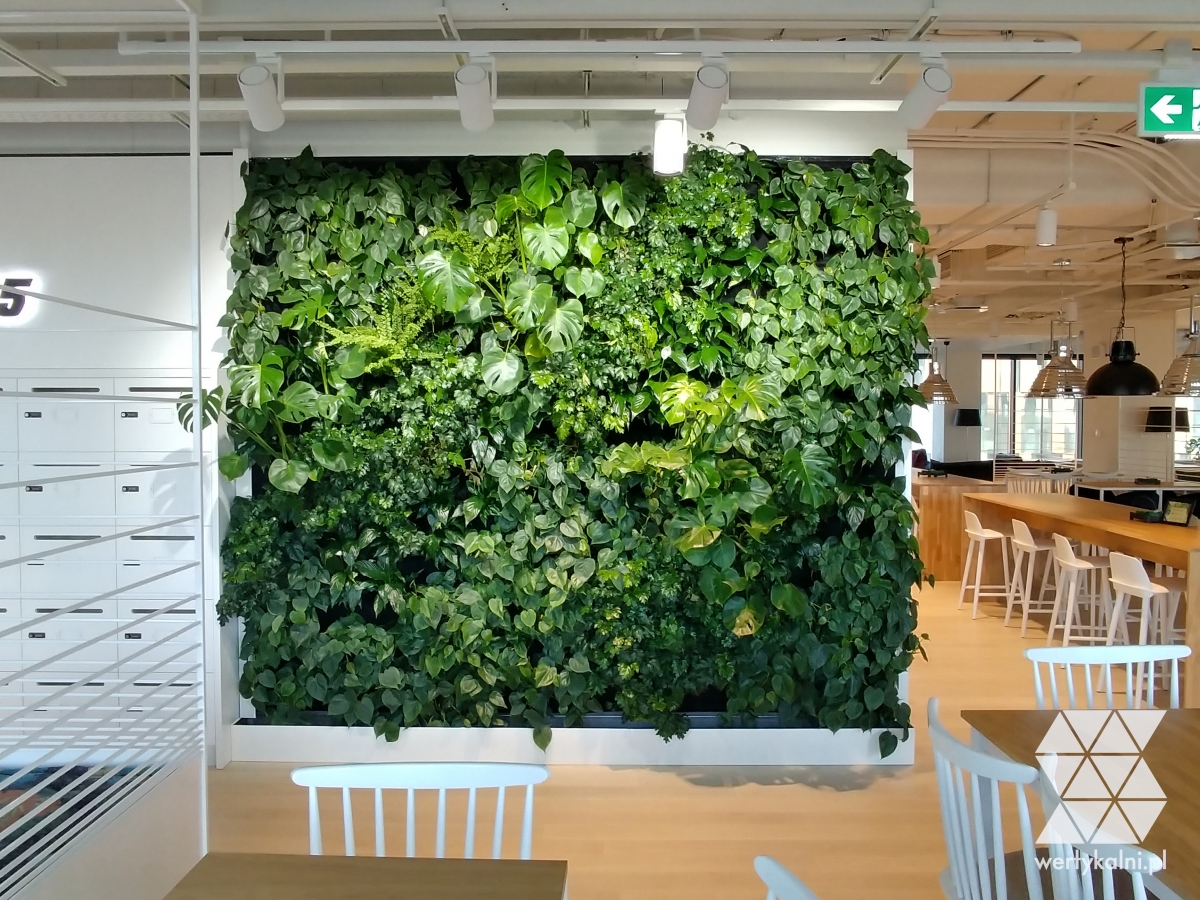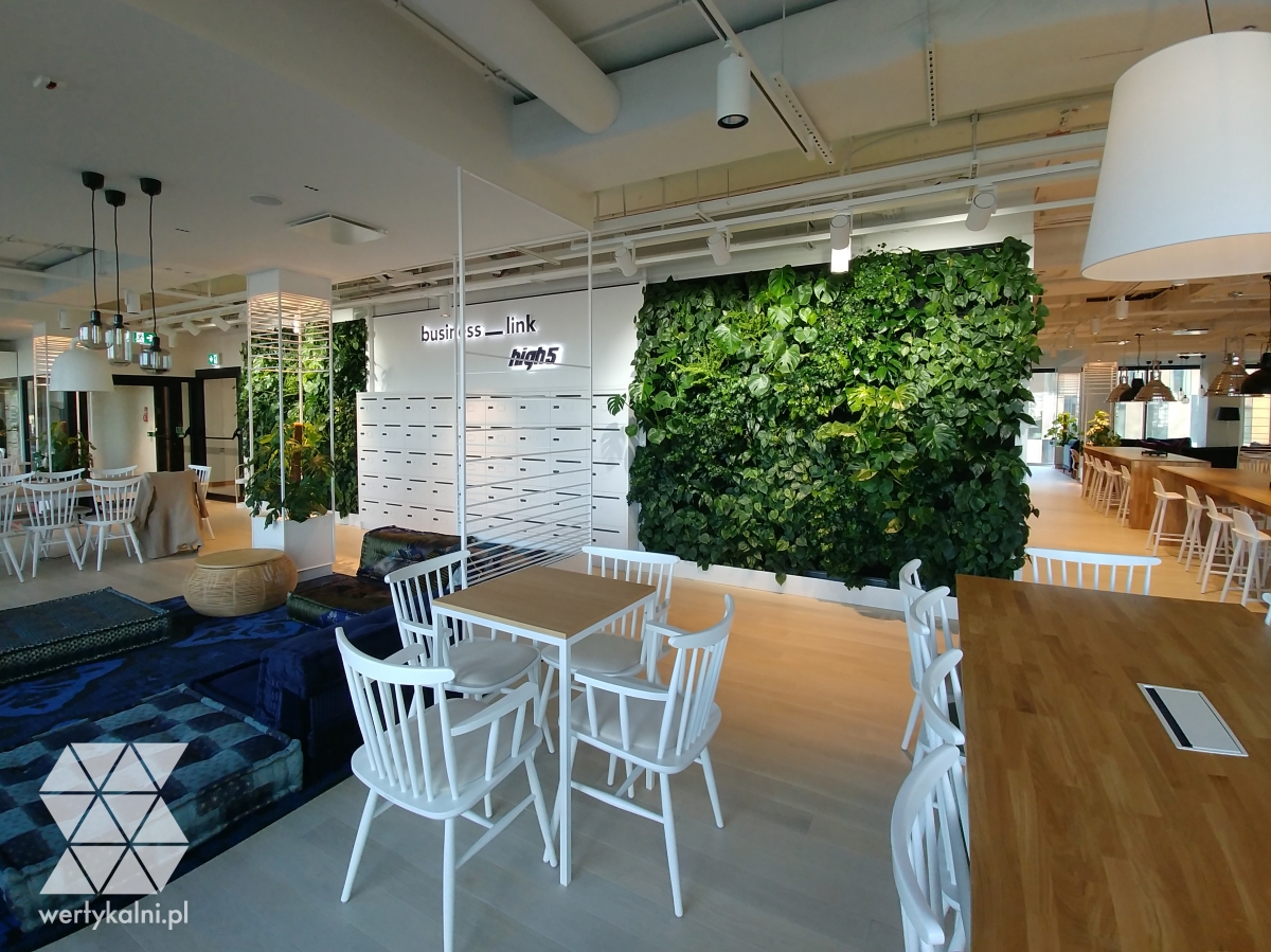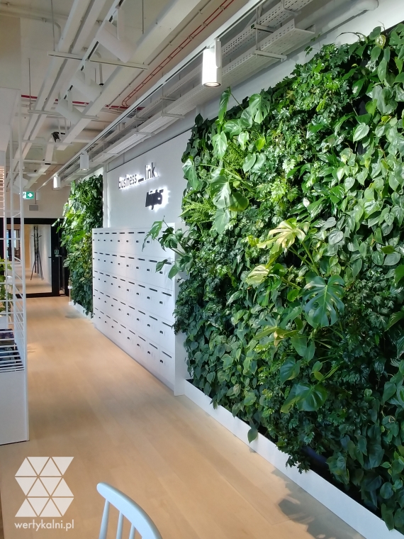 The SKANSKA S.A. company invited us to cooperate in the interior design of the Business Link office. The customer wanted to diversify the interior design and to fill the modern bright and large office space with natural vegetation. We have obtained this effect thanks to the arrangement of symmetrical walls with live greenery with a total area of 16 m2. Among them, a storage space has been separated, where the name of the company and the High 5 building can be both exposed.