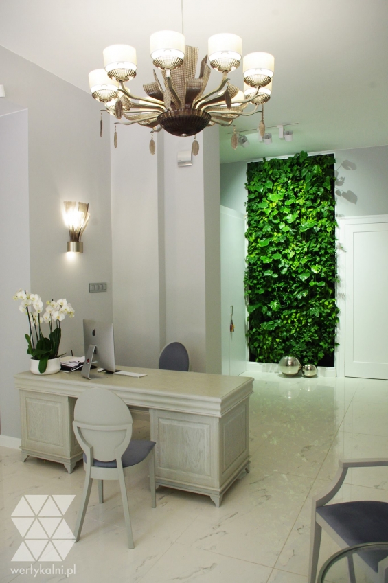 In August 2016, we completed a project of arranging the reception at the La Beaute Clinique aesthetic medicine clinic in Warsaw. For the arrangement of the vertical garden, we used shades of deep green, including extremely lush specimens of monsters. Species diversity has made it possible to achieve a natural irregularity and depth effect. The rectangular vertical system reaches from the floor to the ceiling itself, and the green contrasts clearly with the bright color of the walls, which beautifully enlivens the modern and elegant interior. The green wall was deliberately placed in front of the patient welcome zone to set the mood of the place from the entrance. Natural arrangement is a coherent element of visual communication of the aesthetic clinic, to which patients come in search of perfection. Isn’t nature the best reflection of it?
