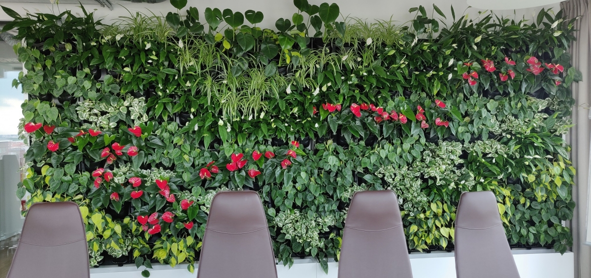 Diverse plant species were used in the project - especially in terms of colour and leaf shape. The bright and well-lit space in the hall perfectly highlights the qualities of the green wall. The species merge gradually, creating an interesting and impressive pattern. Bathed in lush vegetation full of green tones, the beautiful red flowers of the Anthurium plant take centre stage. They accentuate the whole and create an interesting 3D effect. In turn, the white-flowering wings of the Spathiphyllum plant soften up the composition and stimulate to action.