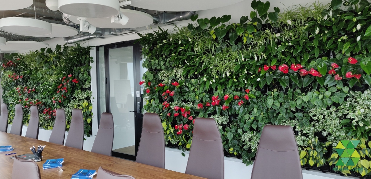 Luxuriance, contrast, greenery and nature - these are just some of the terms that come to mind at the sight of our subsequent project in Warsaw's Mokotów district. The vertical wall made of living plants welcomes and draws the attention of guests in the conference room. It is designed to better serve representative functions, stimulate and foster creativity. All this is accompanied by a beneficial effect on human health because as we all know, green is life.