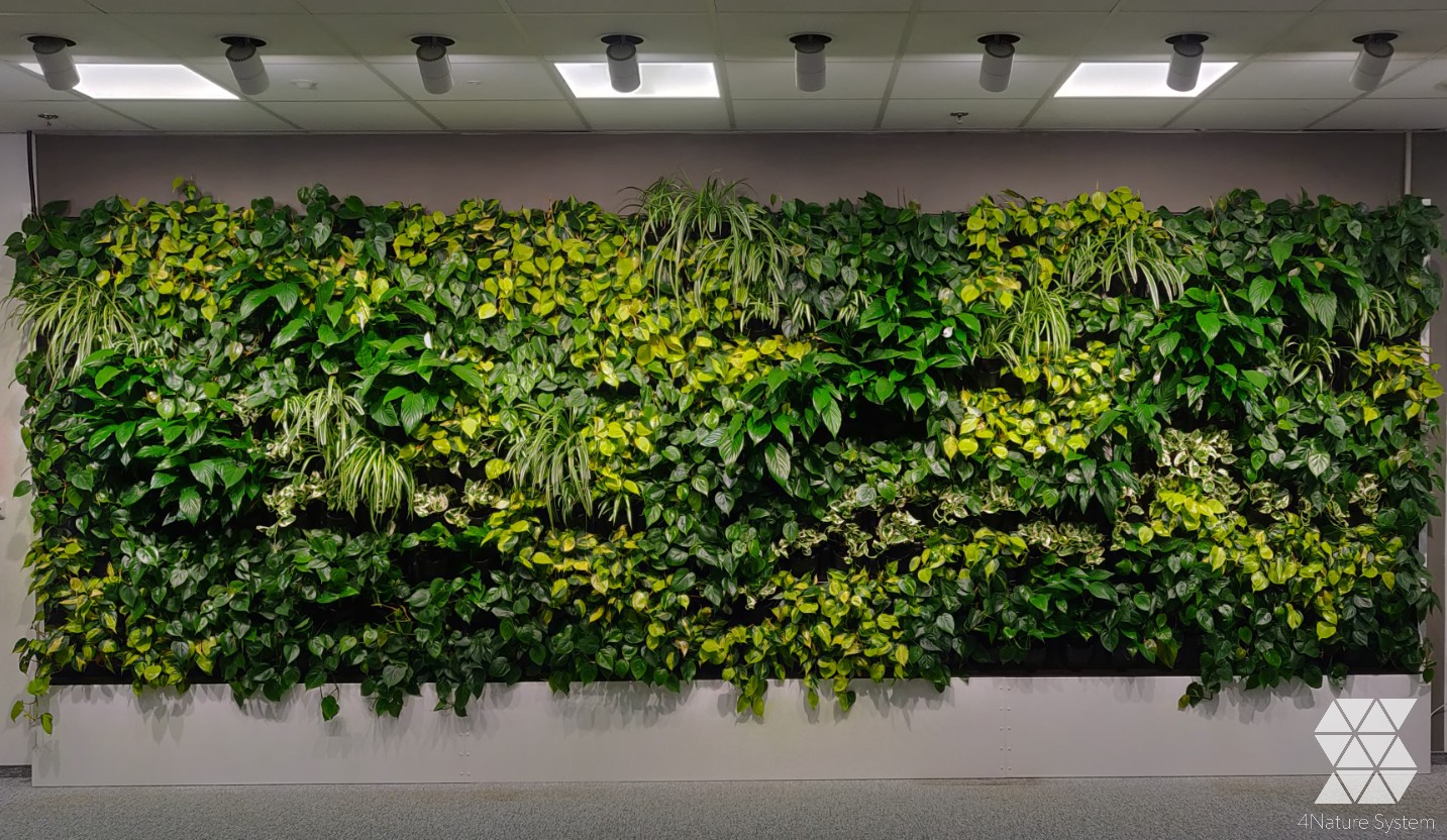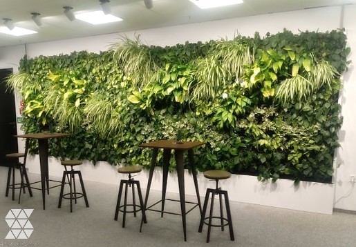 The vegetation on both walls include species of diversified colour and leaf shape. The smaller wall, which welcomes visitors at the reception desk, features additional red flowering plants so that they relate in colour to the company logo located in the front part of the counter. The larger wall in the open space creates a lush clump effect. It is a substitute for nature in the interior. It perfectly emphasises the space, and at the same time relieves stress, calms and pleases the eye.