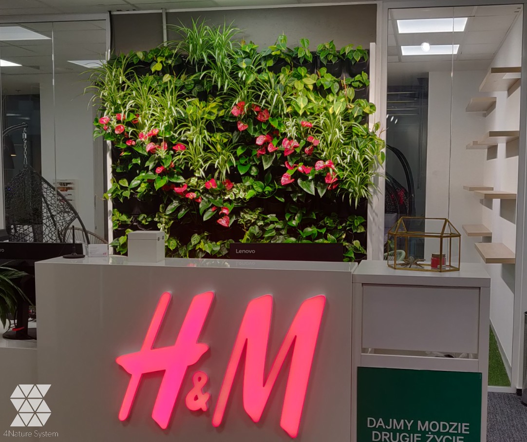 We have prepared a proposal of two vertical walls with a total area of 18.8 m2 for one of the Warsaw offices of our client, the Swedish clothing enterprise H&M (Hennes & Mauritz} Sp. z o.o. The green walls made of living plants are located on two levels, one of which is a welcome and representative element at the reception area, while the second embellishes the open recreational space located near the workstations.