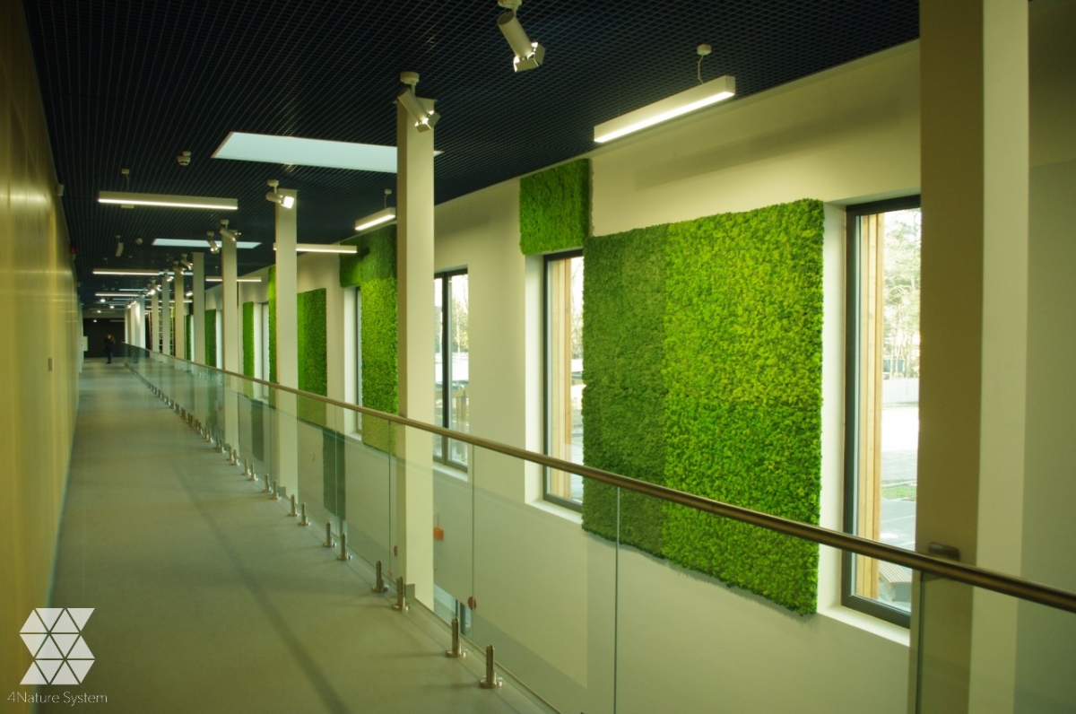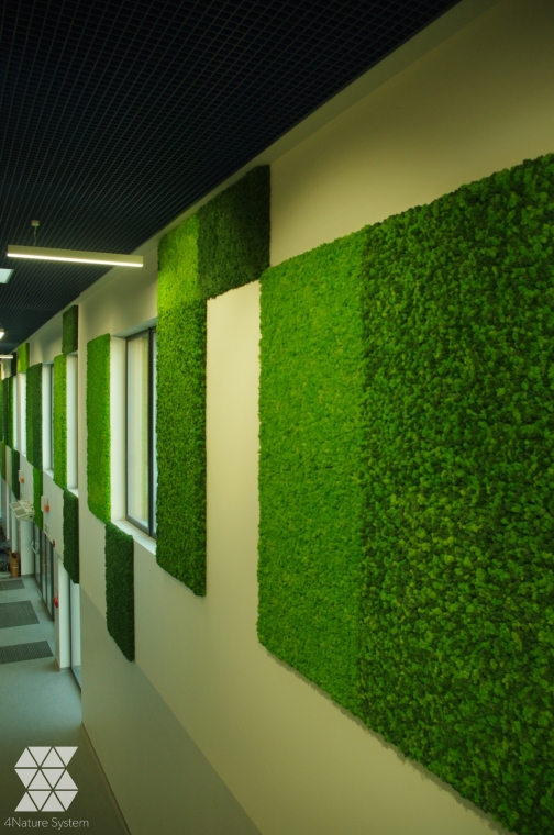 The remaining panels made from Cladonia moss were mounted in the same space. Owing to their location within the communication route along the corridor, they were executed on a special, non-flammable MDF base. The light and dark green panels were laid out alternately, in a geometric and coherent arrangement. The moss greenery enlivened the white walls perfectly and gave the space an energetic feel.