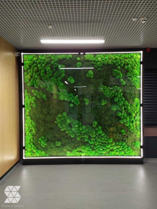 The first of the compositions made of forest pole moss and flat forest moss in the ratio 1:1 was mounted in the display cabinet, illuminated with LED strips. The display cabinet is located opposite one of the entrances to the building. The layout of the pole moss is organic, resembling the natural one. The arrangement perfectly accentuates the interior.