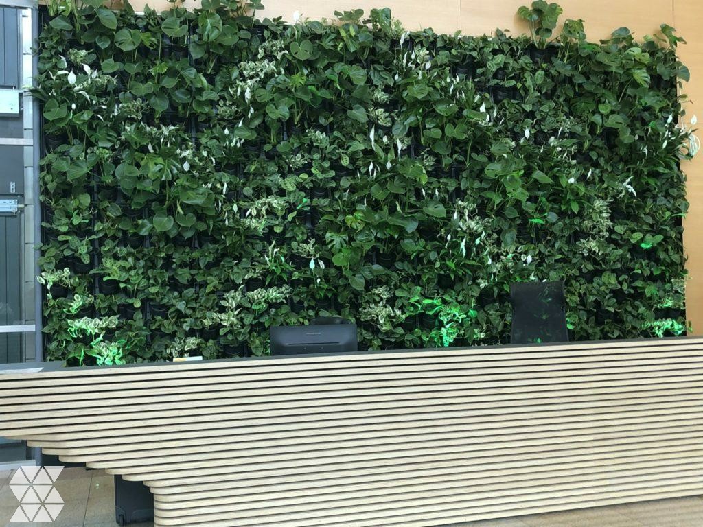 The wall of living plants is located on the ground floor near the reception. The composition includes mainly species with green leaves (Creeping Philodendron), which provides a compact background for the whole. Colour is highlighted by species with coloured leaves (Epipremum var. N'Joy, Maranta var. Fascinator Tricolor) and white flowering Spathiphyllum (commonly known as Spath or Peace lilies). The introduction of Monstera deliciosa in the upper parts adds a three-dimensional effect to the wall.