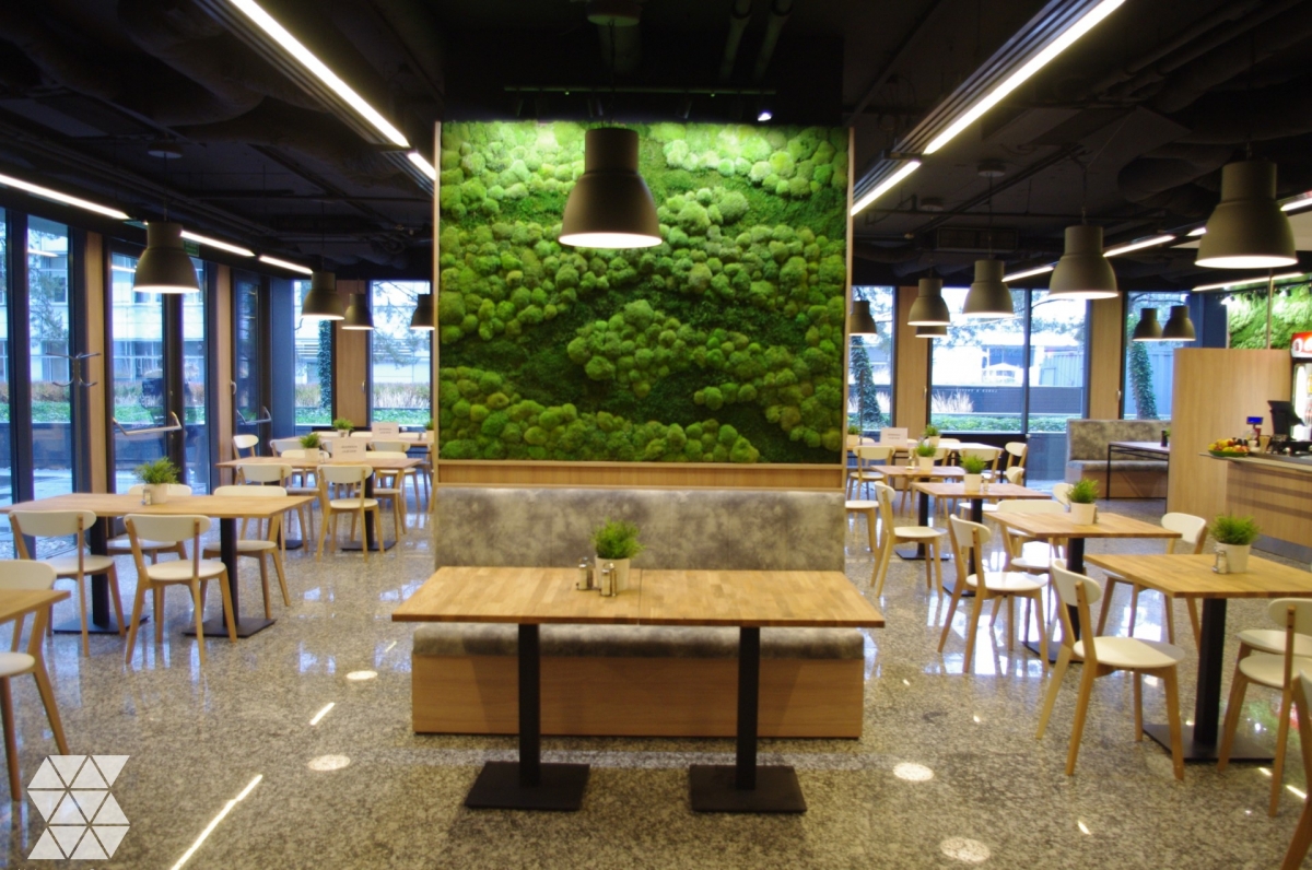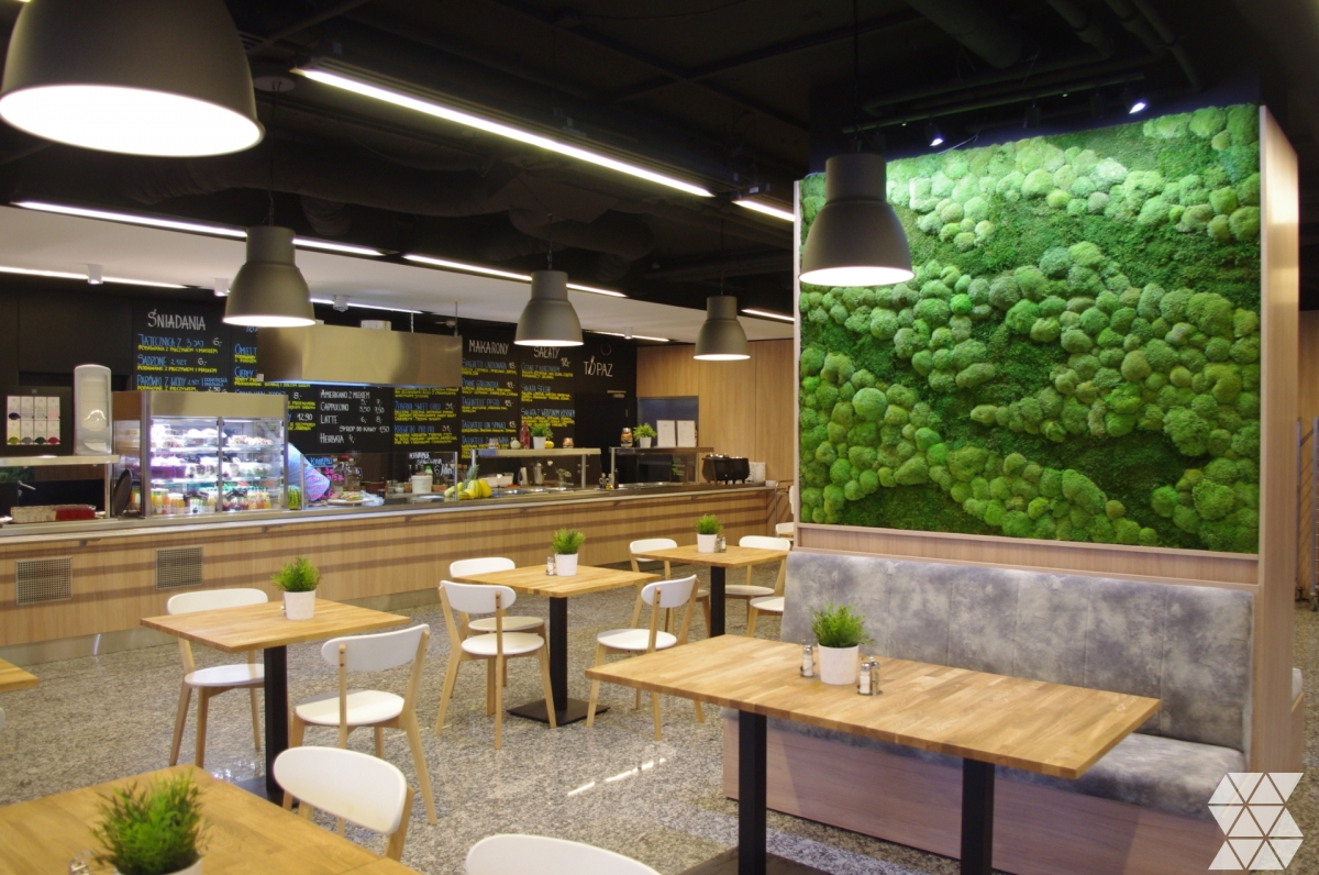 We designed green moss walls for Warsaw restaurant Topaz Luch & Coffee. The client wanted to introduce nature into the interior. In a space limited by furniture and traffic, we proposed stabilised moss walls, which proved to be a great and novel solution.