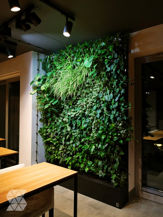 The entire height of the vertical garden has been marked by shades of deep green, which do not distort the room's harmony and do not cause excessive distraction. In the arrangement, we introduced subdued colourful species, such as Philodendron Scandens, Epipremnum Aureum, Epipremnum NJoy variety, Monstera and Chlorophytum.