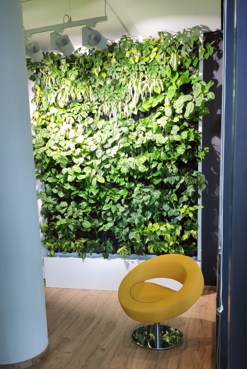 The vertical garden itself is almost 2 metres wide and reaches up to the ceiling. The unique composition of 120 plants, including two varieties of philodendron, maranta, epipremnum aureum and monstera, covers a total area of 5.51 m2. A green wall with an automatic irrigation and control system is placed in the corner of the common zone, right next to the glass partition wall. The vertical garden neatly completes the bright space, also thanks to the components blending into the environment - the housing of the plant panel sides, lamps on the rail and the tank are in neutral white. A green wall made of grass green light reindeer moss with an illuminated Herbalife Nutrition inscription deserves special attention. Thanks to the uniform green surface the logo presents well and corresponds to the brand philosophy, which makes it an interesting modern flagship of the company.