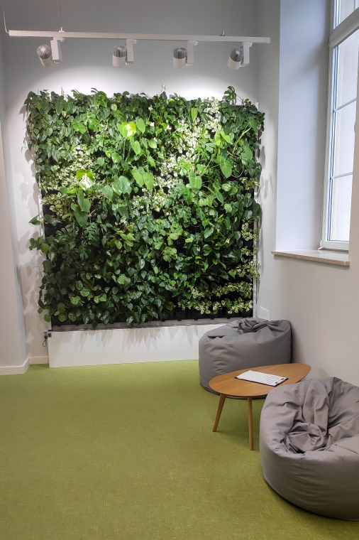 A peaceful corner of the educational institution turned green with different species of plants - the living thicket of nearly 150 specimens consists of, among others, N'Joy' epipremnum, monstera deliciosa, anthurium and maranta. The automatic irrigation system in a closed circuit facilitates plant maintenance, while the white housing and four spotlights on the busbar of the same colour blend into the bright space of the relaxation zone. The whole is an eye-catching and functional system, in the company of which high school students can gather their thoughts, calm nerves and gain strength for even more effective learning.