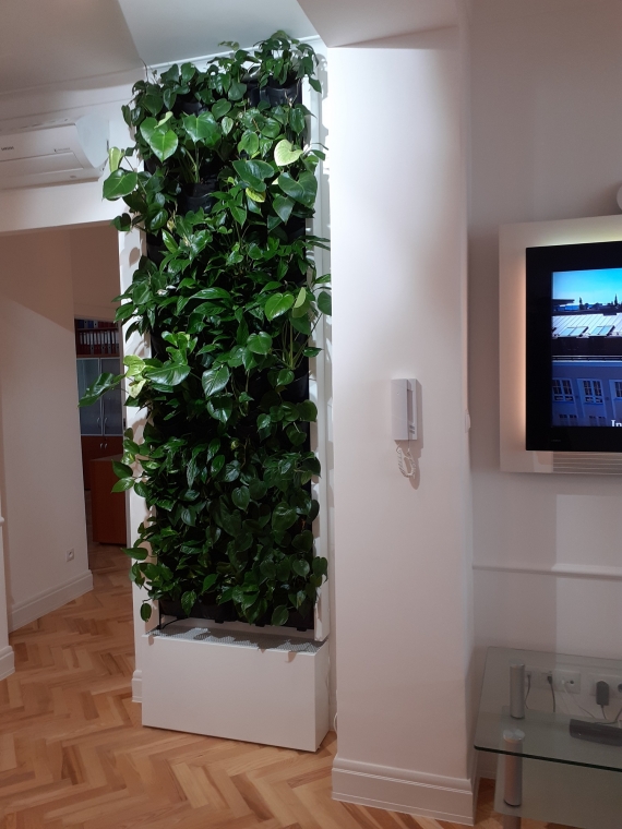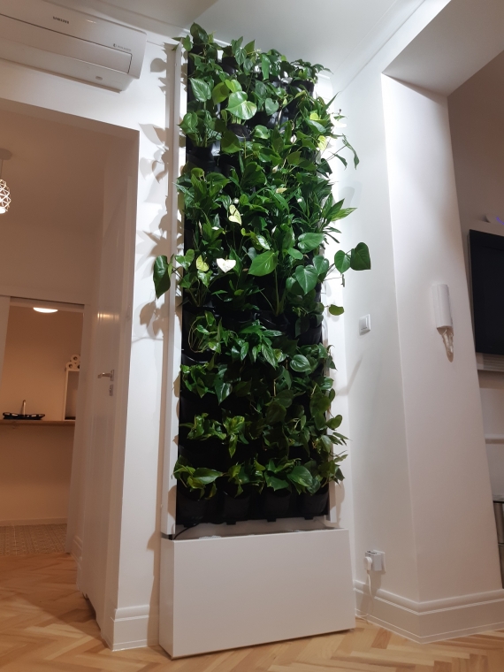 We wanted to arrange some free space in a connecting room, located directly near the passageway. So we prepared a design of a vertical garden in a narrow and longitudinal shape (80.2 x 279 cm), which allowed to cover the undeveloped piece of the wall. 48 plants were placed on a total area of 2.24 m2. The arrangement is mainly made of philodendron scandens, epipremnum aureum and spathiphyllum with white flowers; we also applied miniature monstera, fatsia japonica and anthurium andraeanum, four exotic specimens each. The selection of plants with leaves in a diverse shape, texture and shade, interspersed here and there with white flowers, made a natural coherent effect. Lamps on the bases, housing of the plant panel sides and the tank are also white, which gives the impression that the vertical garden grows directly on the office wall.