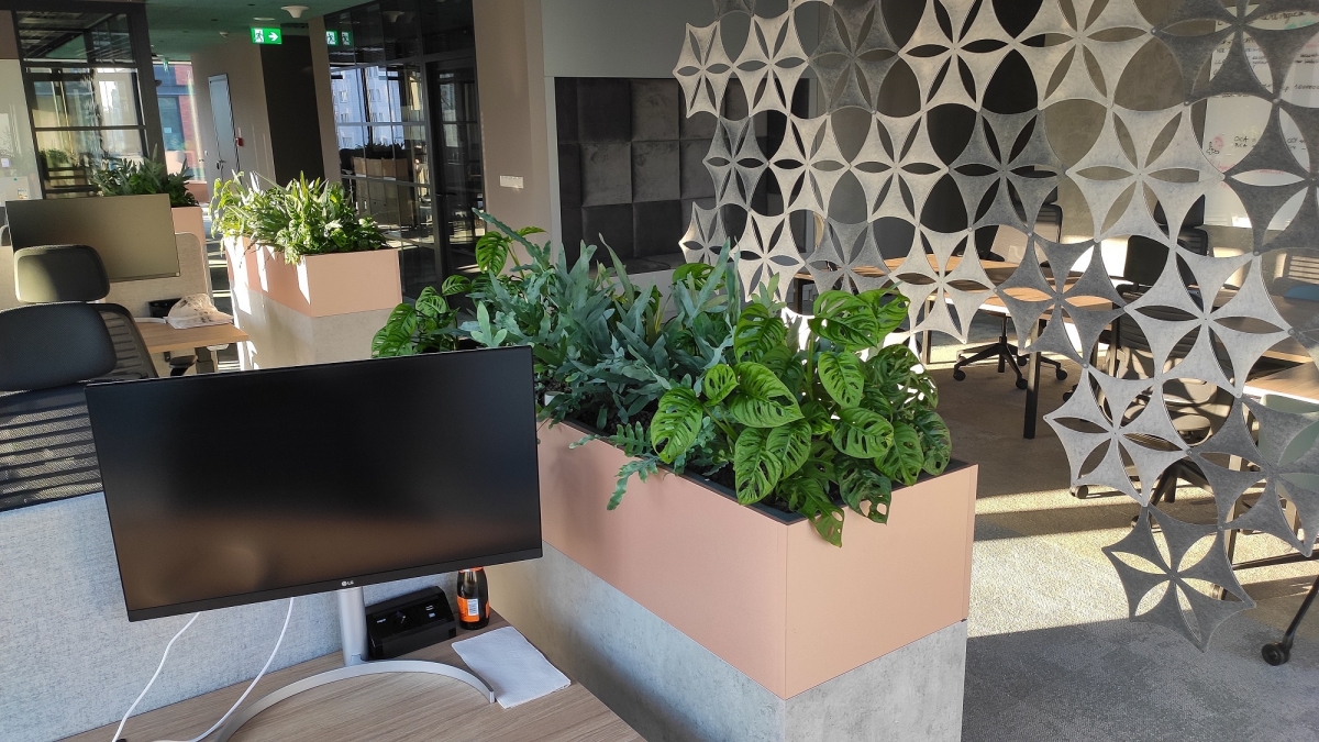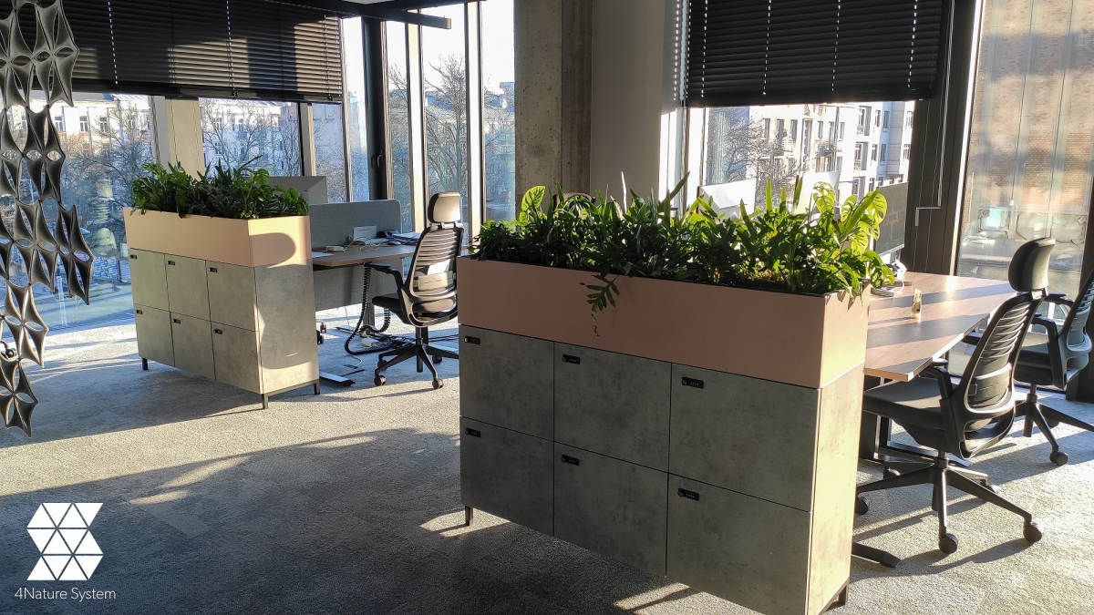 Besides, we placed plants in rectangular pots and free-standing plants in round pots at the customer's request. Monkey Mask monstera, maranta, phlebodium aureum, spathiphyllum - these are just some of the species included in these compact arrangements. The headquarters of Vodeno is one of the most green and employee-friendly offices in Warsaw - on one of the floors there are walls of plants, and on the other there are constructions with plants as well as furniture partitions with pots and screens. A total of 630 plants have been installed in this project.