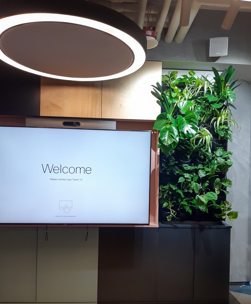 The interior of the Vodeno headquarters is decorated with four green walls made of live plants. Three smaller walls, in the built-in furniture, can be found at the reception desk and in the conference room. The last and the largest wall spreads in an open cafeteria, which is also a social and event area. In addition to philodendrons and the epipremnum aureum, our arrangements also include among others, monstera (deliciosa, leuconeura and Monkey Mask), maranta, clivia miniata or ellen danica. The four green walls cover a total area of 12.7 m2.