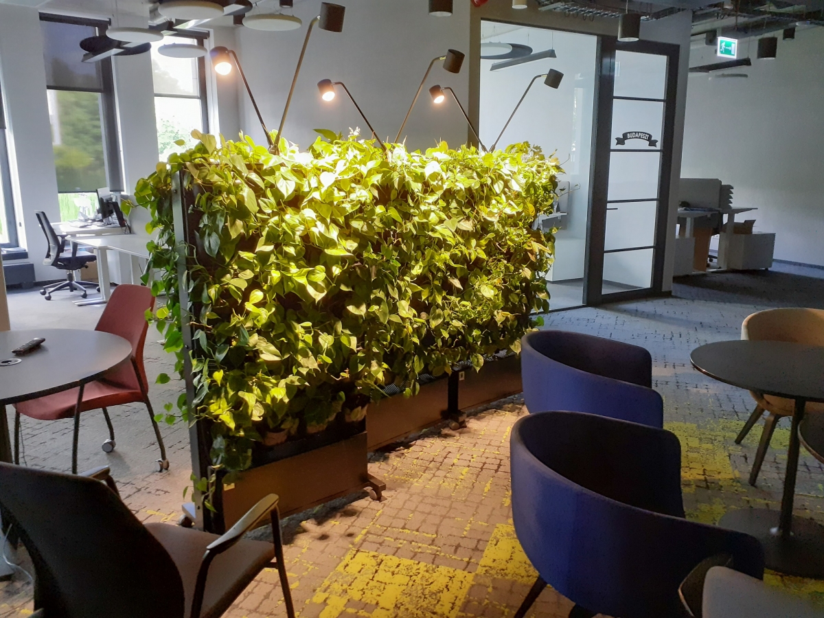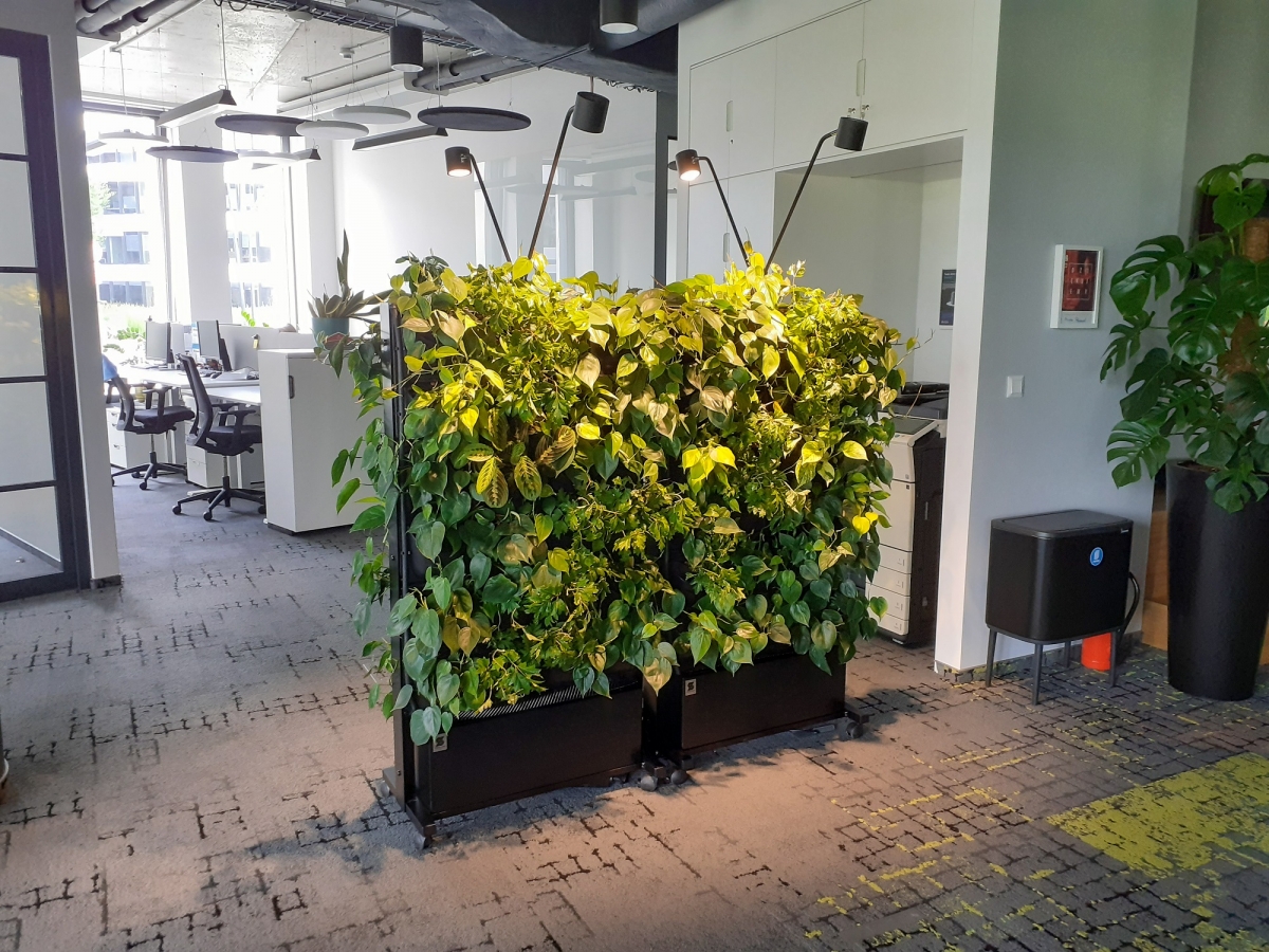 Five mobile pieces of green furniture on wheels were installed in the Arriva's office in Warsaw. Double-sided, vertical constructions with live plants can be easily moved from one place to another, making the space green or separating the selected space. A single frame consists of twelve 4Nature System modules, i.e. 48 plants; the Arriva's headquarters gained a total of 240 specimens and 9 m2 of greenery.