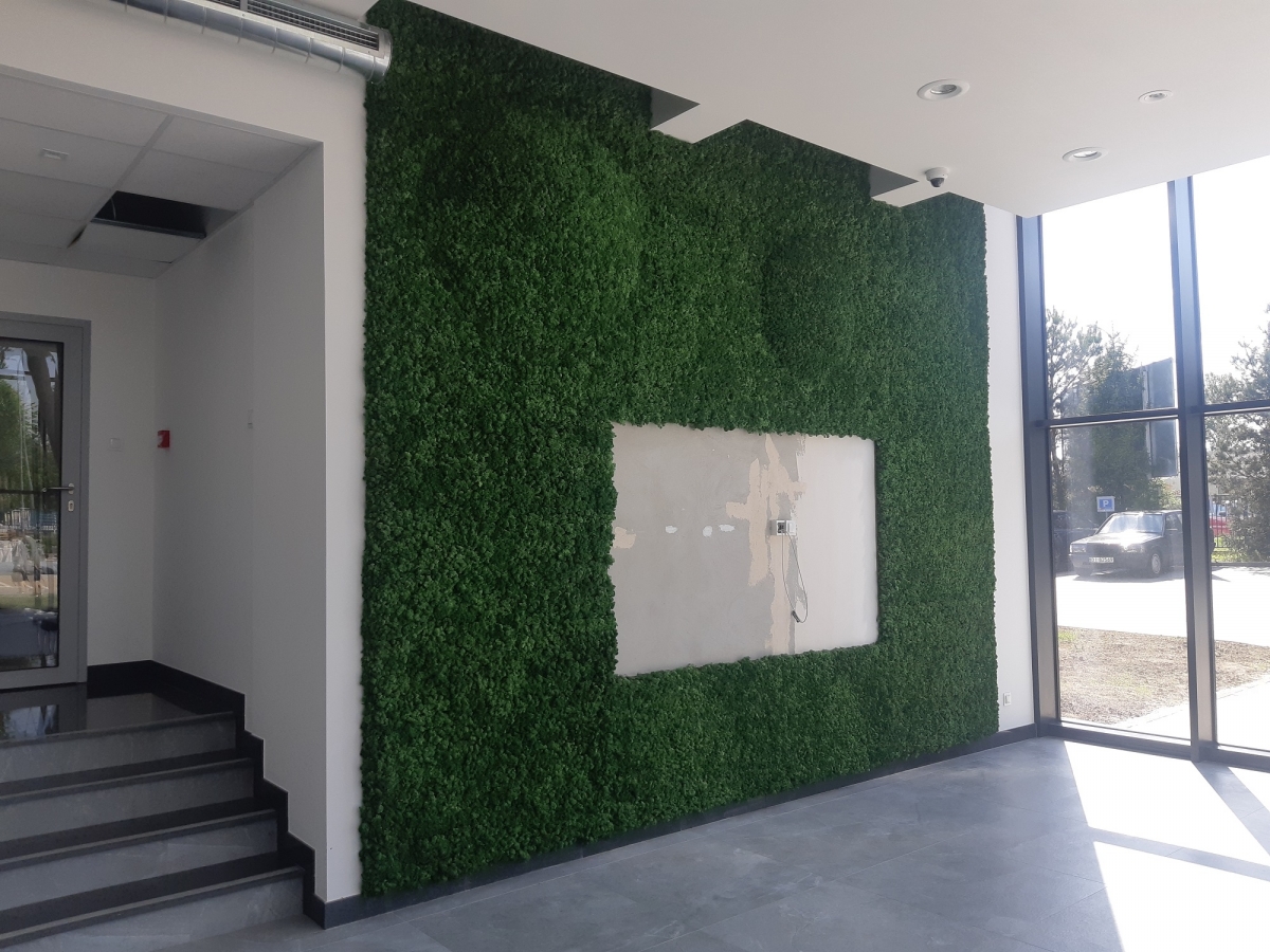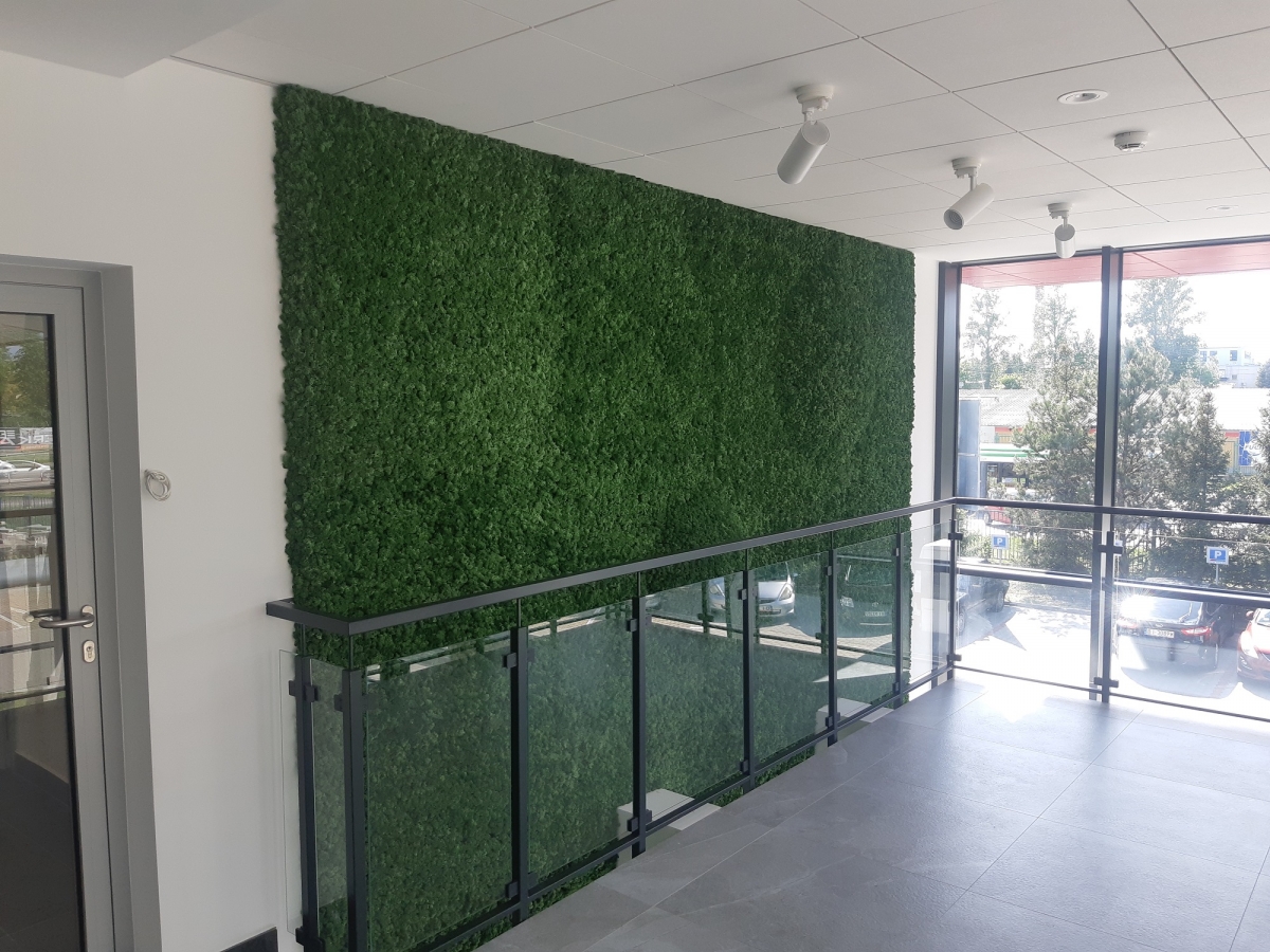 In May 2020, we prepared a proposal of a biophilic fit-out for AC Spółka Akcyjna. We installed a green 4Nature Moss wall in the lobby of the company's headquarters in Białystok. The installation is about 7 meters high and covers a total area of 27.68 m2 - extending from the building's ground floor to the first floor. We designed it from stabilised lichen, which does not require nursing - reindeer lichen (Cladonia rangiferina) in a vibrant, green shade of Grass Green.