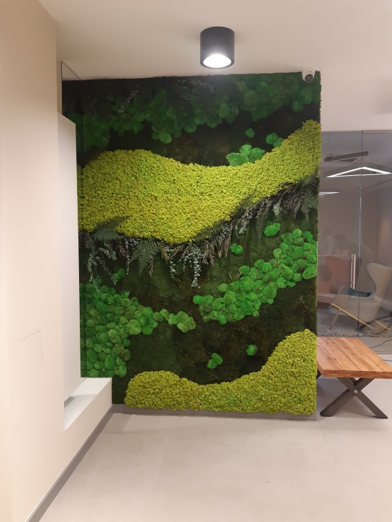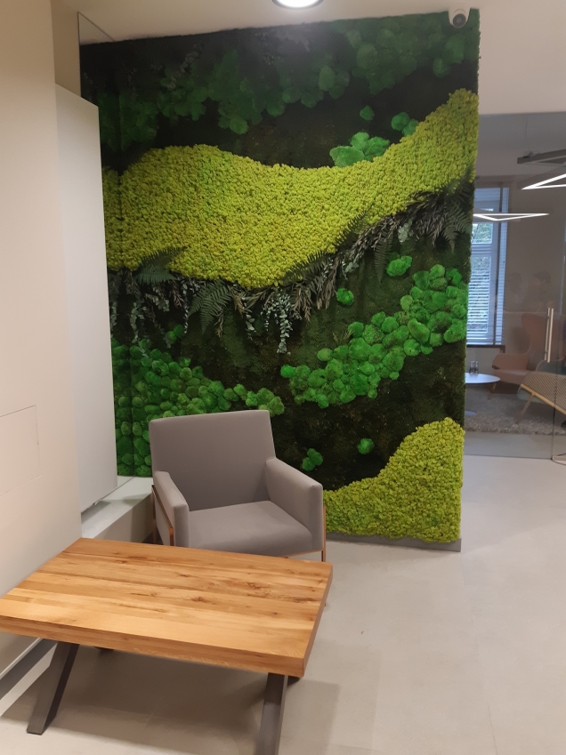 Our common mission undertaken with the architect Agnieszka Szambelan was to revive the interior of the Warsaw law firm. It was a custom-designed project, with the intention of making the welcome zone more attractive - this moss project is the beginning of our further cooperation, as we are currently working on introducing live vegetation elsewhere. The owners of the interior have decided to apply stabilised plants because they wanted a solution with long-term durability that would revive and decorate the interior, and at the same time not require any maintenance or lighting. In the stabilisation process, the original properties of plants, including their shape and texture, have been preserved, which allows to bring nature closer to the users of the interior. The vertical garden at the entrance to the office welcomes clients of the law firm from the very doorstep.