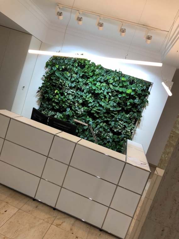 In cooperation with the Kobel Architekten design studio, we have arranged a reception zone at the German Chamber of Commerce and Industry. We have prepared a rectangular design of a vertical wall with a total of 168 live plants in a homogeneous composition. The investor wanted only greenery, without flowers, so we chose species of varied shape and colour of the leaves.