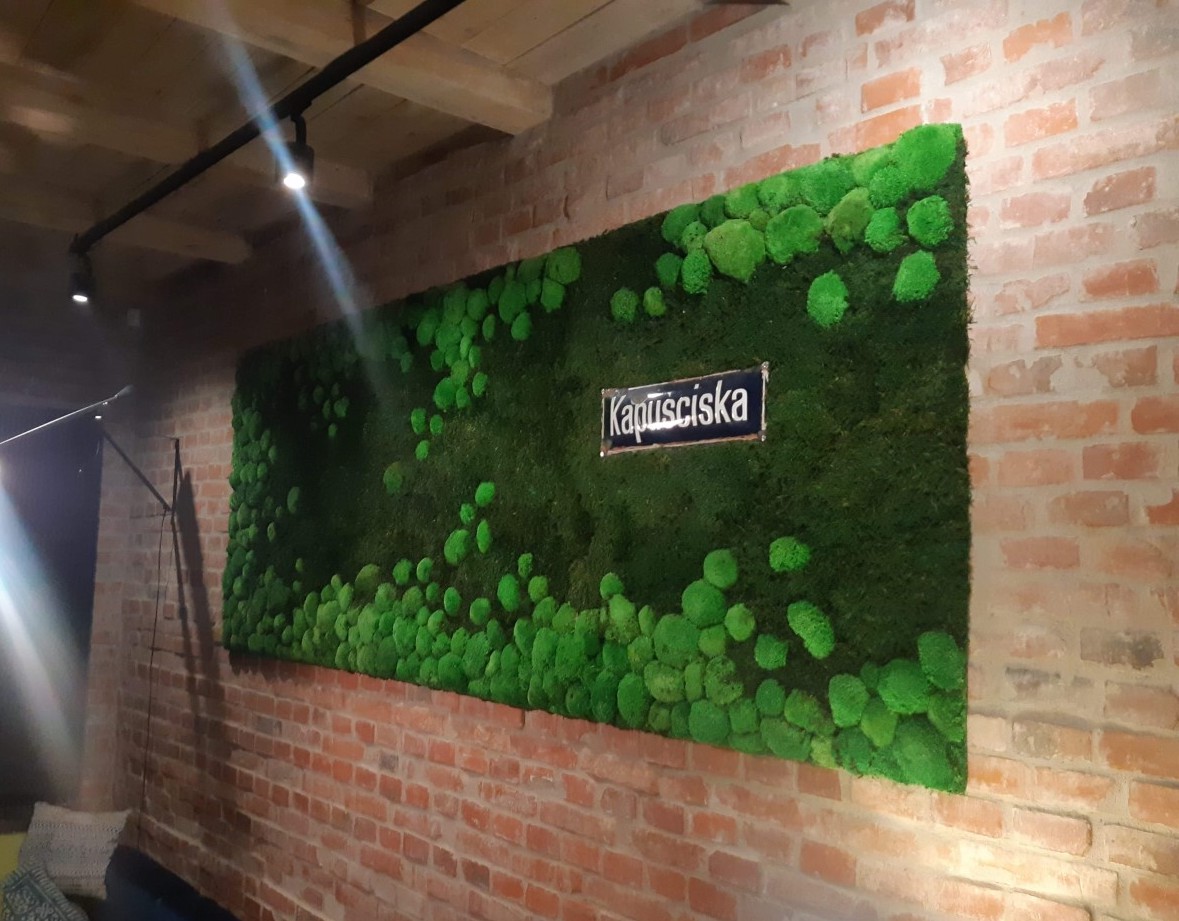 In the autumn of 2020, we created a green wall in one of the interiors in Bydgoszcz. We used two types of forest moss - flat and pole - in the 1:1 ratio to create the arrangement. The first variety is mainly in the middle, and the other one at the sides of the composition, while the asymmetries and irregularities make the arrangement of the tufts organic, similar to the natural one. The space users wanted us to integrate a plate with the name of the housing estate in Bydgoszcz, so we displayed it against a flat, darker piece of a green wall.