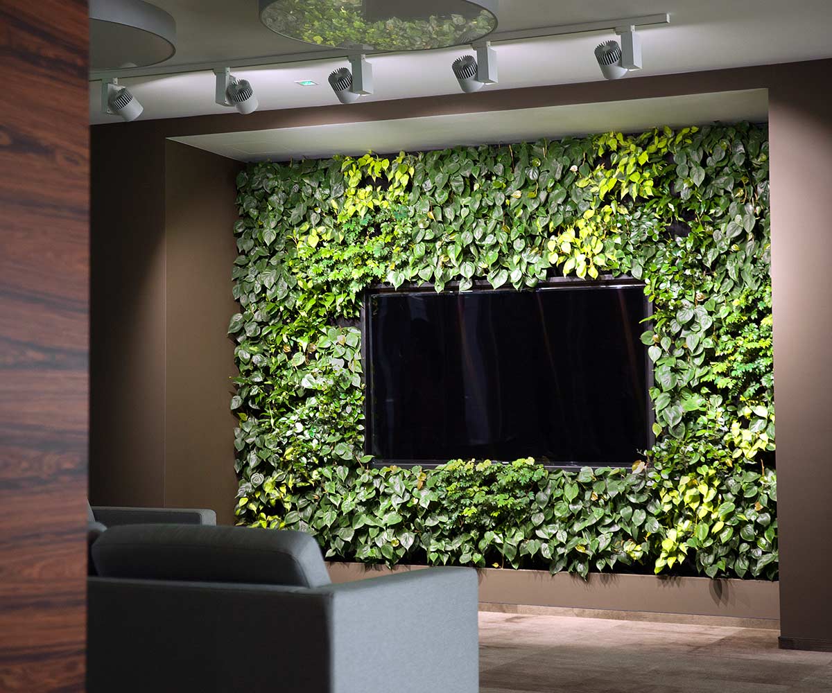 Green walls made of plants are ideal as a background for a TV screen and projection screen, both for informal and formal meeting places. We carried out such an implementation in 2016 in Warsaw. The biggest advantage of this solution is the positive effect of plants on relaxing the eyes and calming the mind during presentations displayed on a TV screen. We have managed to significantly improve the room acoustics, thanks to the 4Nature System panels (made of recycled plastic) and the amount of plants: 25 per 1 m2. In an atmosphere of relaxation, it is easier to collaborate, concentrate and be creative - all that is necessary to make business meetings run smoothly and creatively. Assimilation lighting, which is part of vertical gardens, strengthens plant development and emphasizes the diversity of colours and textures of plants. The whole works very well with the modern and spacious office interior.