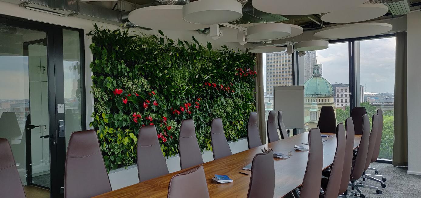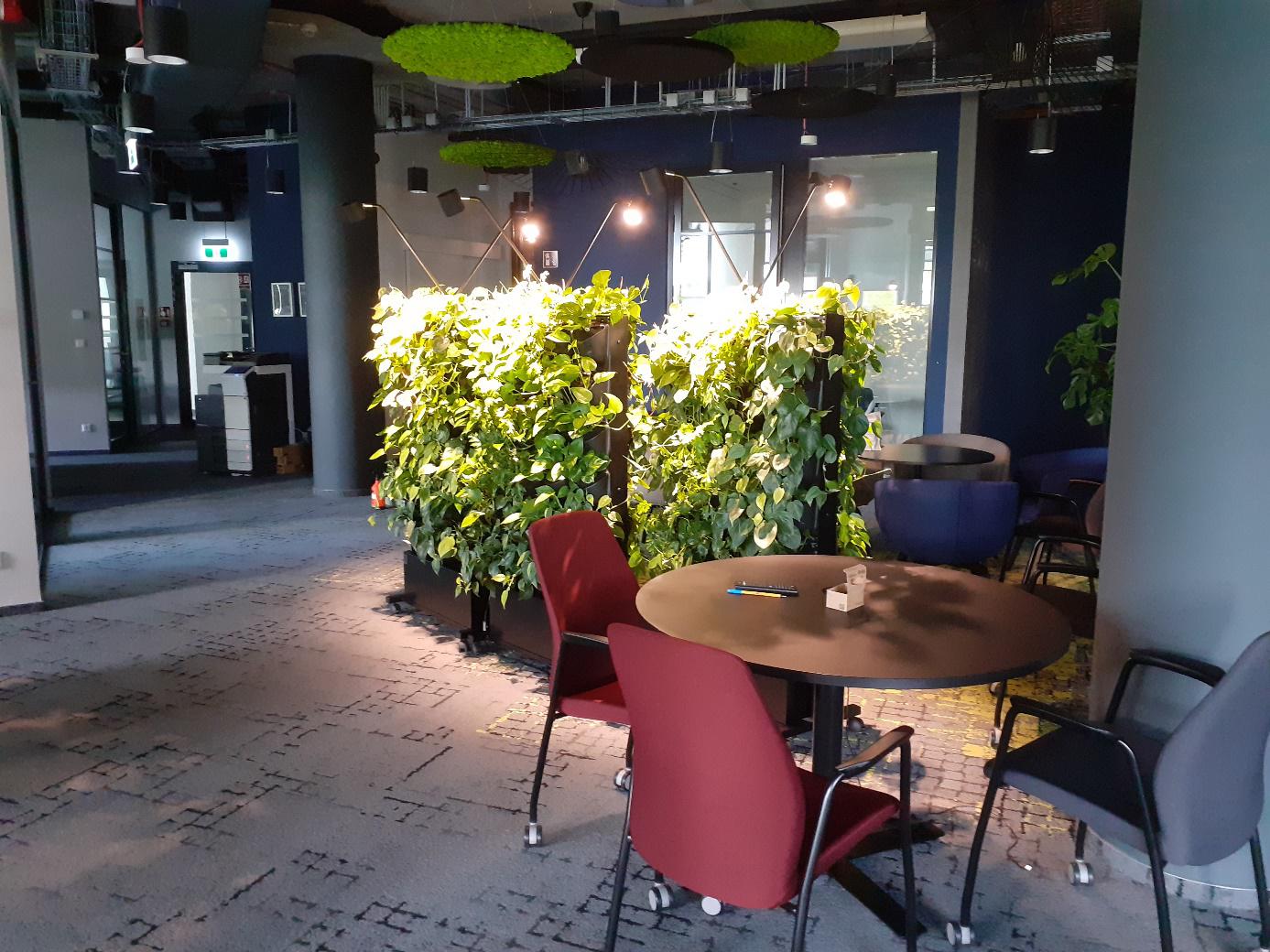 1. Wizualny kontakt z naturą – czyli widok na elementy przyrody i żywe systemy oraz przenikanie się wnętrza z zewnętrzem. Przykładem może być sytuowanie stanowisk pracy w pobliżu okien z widokiem na zieleń, niebo czy wodę. Oczywistym rozwiązaniem jest obecność w pomieszczeniu żywych roślin, w tym donic, kwiatów ciętych czy wysp roślinnych. Doskonale sprawdzają się tutaj ogrody pionowe, które pozwalają zmieścić dużo roślinności bez straty przestrzeni użytkowej. Zapoznaj się z naszą ofertą żywych ścian wertykalnych na wymiar – system automatycznego nawadniania i sterowania sprawia, że wymagane czynności pielęgnacyjne zostają ograniczone do niezbędnego minimum.